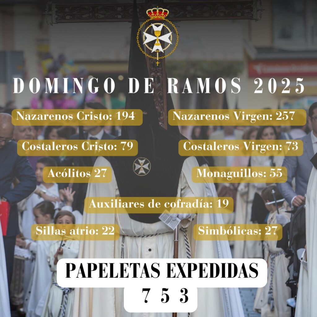 Informamos que para el próximo Domingo de Ramos de 2025 se han expedido 753 papeletas de sitio. Los listados de cofradía se podrán consultar a partir de hoy a las 19:30h en el patio del colegio salesiano. Además, a través de »El Portal del Hermano» en el apartado »Papeletas de Sitio» se puede consultar el […]