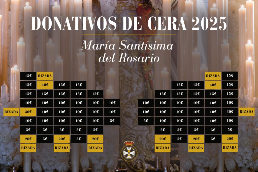 La Hermandad pone a disposición de los hermanos, hermanas y devotos la cera de los pasos de Nuestros Amantísimos Titulares que los alumbrarán el próximo Domingo Ramos. Podrán reservarla en el cuadrante que se encontrará en la Casa de Hermandad, o a través del WhatsApp de la Hermandad 681 05 01 77.