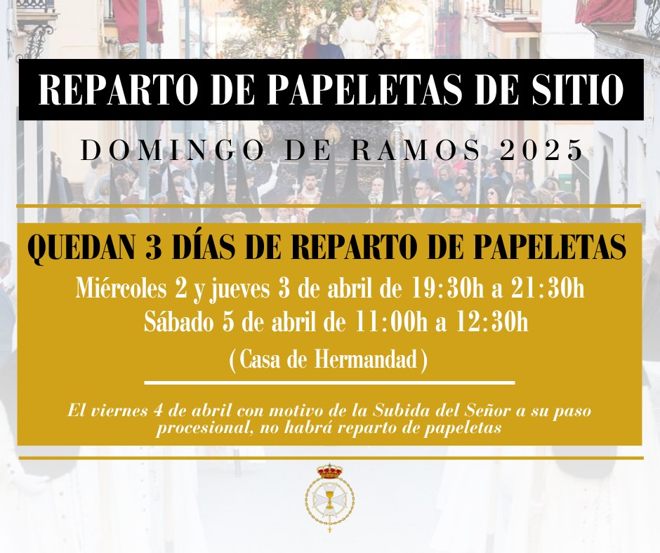 Recordamos a todos los hermanos y hermanas que quedan 3 días de reparto de papeletas de sitio. 𝐌𝐢𝐞́𝐫𝐜𝐨𝐥𝐞𝐬 𝟐 𝐲 𝐣𝐮𝐞𝐯𝐞𝐬 𝟑 𝐝𝐞 𝐚𝐛𝐫𝐢𝐥: de 19:30h a 21:30h 𝐒𝐚́𝐛𝐚𝐝𝐨 𝟓 𝐝𝐞 𝐚𝐛𝐫𝐢𝐥: de 11:00h a 12:30hRecordamos igualmente, que el 𝐯𝐢𝐞𝐫𝐧𝐞𝐬 𝟒 𝐝𝐞 𝐚𝐛𝐫𝐢𝐥 𝐧𝐨 𝐡𝐚𝐛𝐫𝐚́ 𝐫𝐞𝐩𝐚𝐫𝐭𝐨 𝐝𝐞 𝐩𝐚𝐩𝐞𝐥𝐞𝐭𝐚𝐬 debido a la Subida del Señor en […]