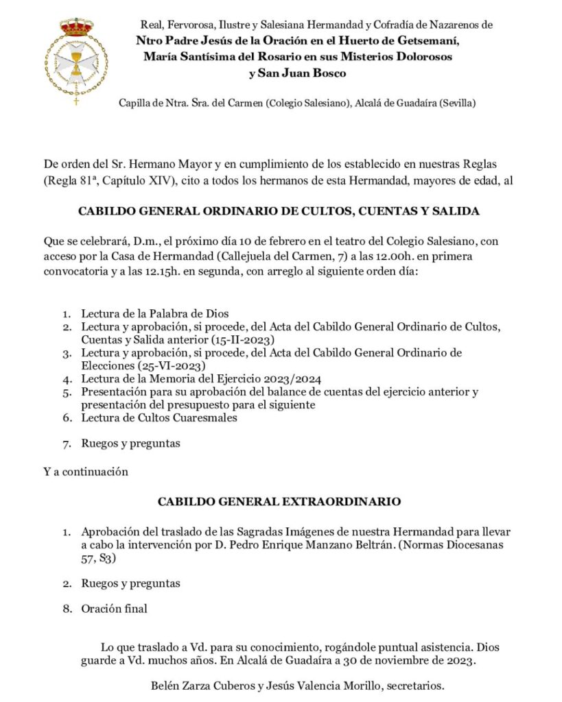 Desde esta Hermandad, se convoca a todos los hermanos mayores de edad al Cabildo General Ordinario de Cultos, Cuentas y Salida que se celebrará, D.m, el próximo 𝐬𝐚́𝐛𝐚𝐝𝐨 𝟏𝟎 𝐝𝐞 𝐟𝐞𝐛𝐫𝐞𝐫𝐨 𝐞𝐧 𝐞𝐥 𝐭𝐞𝐚𝐭𝐫𝐨 𝐝𝐞𝐥 𝐂𝐨𝐥𝐞𝐠𝐢𝐨 𝐒𝐚𝐥𝐞𝐬𝐢𝐚𝐧𝐨. El acceso será por la Casa de Hermandad (Callejuela del Carmen, 7). – Primera convocatoria a las 𝟏𝟐:𝟎𝟎𝐡. […]