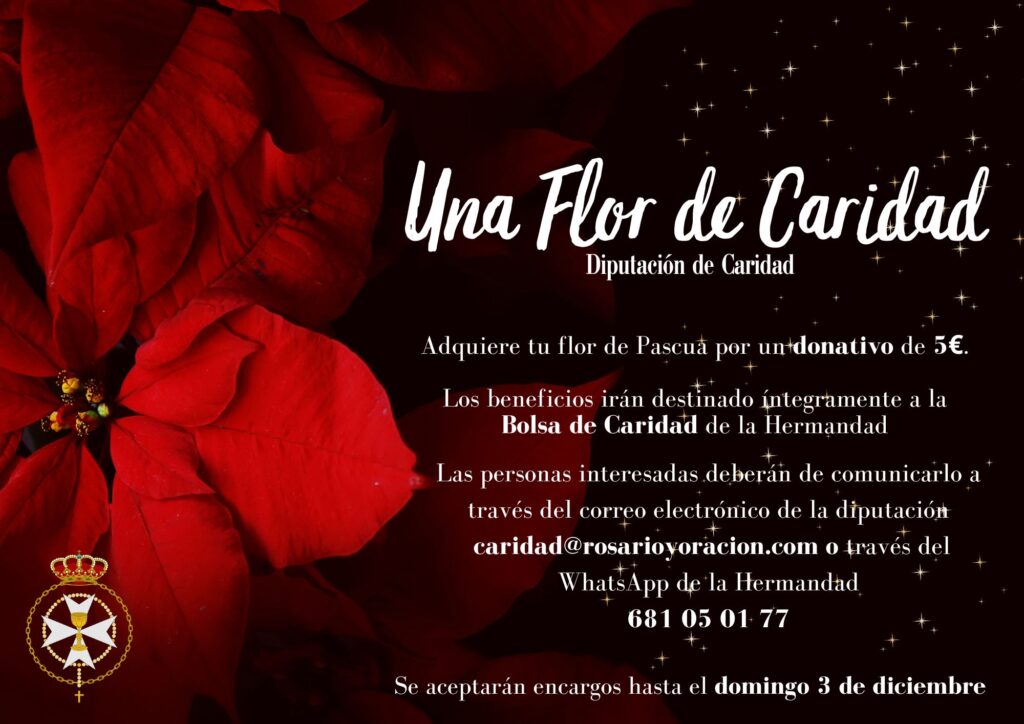 | UNA FLOR DE CARIDAD Colabora con el proyecto “𝐔𝐧𝐚 𝐅𝐥𝐨𝐫 𝐝𝐞 𝐂𝐚𝐫𝐢𝐝𝐚𝐝” adquiriendo tu flor de Pascua por un 𝐝𝐨𝐧𝐚𝐭𝐢𝐯𝐨 𝐝𝐞 𝟓€, el beneficio irá destinado íntegramente a la Bolsa de Caridad de nuestra Hermandad. Puedes 𝐫𝐞𝐬𝐞𝐫𝐯𝐚𝐫𝐥𝐚𝐬 𝐚𝐧𝐭𝐞𝐬 𝐝𝐞𝐥 𝟑 𝐝𝐞 𝐝𝐢𝐜𝐢𝐞𝐦𝐛𝐫𝐞 indicando la cantidad además de tu nombre completo, email y teléfono de […]