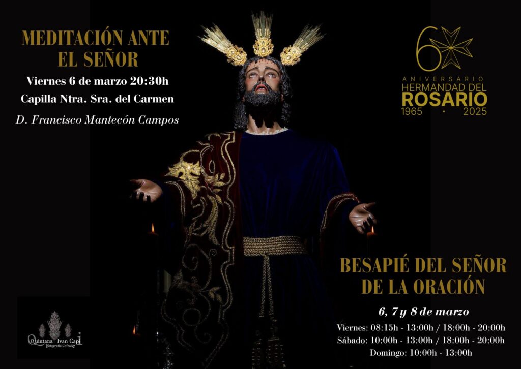 La Hermandad del Rosario convoca a sus hermanos y devotos a vivir unos días de oración y recogimiento ante el Señor de la Oración. Meditación ante el Señor – Viernes 6 de marzo – 20:30 h – Capilla Ntra. Sra. del Carmen – A cargo de D. Francisco Mantecón Campos Besapié del Señor de la […]