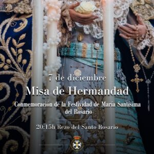 Con motivo de la Conmemoración de la Festividad de María Santísima del Rosario, el próximo sábado 7 de diciembre celebraremos nuestra Misa de Hermandad.