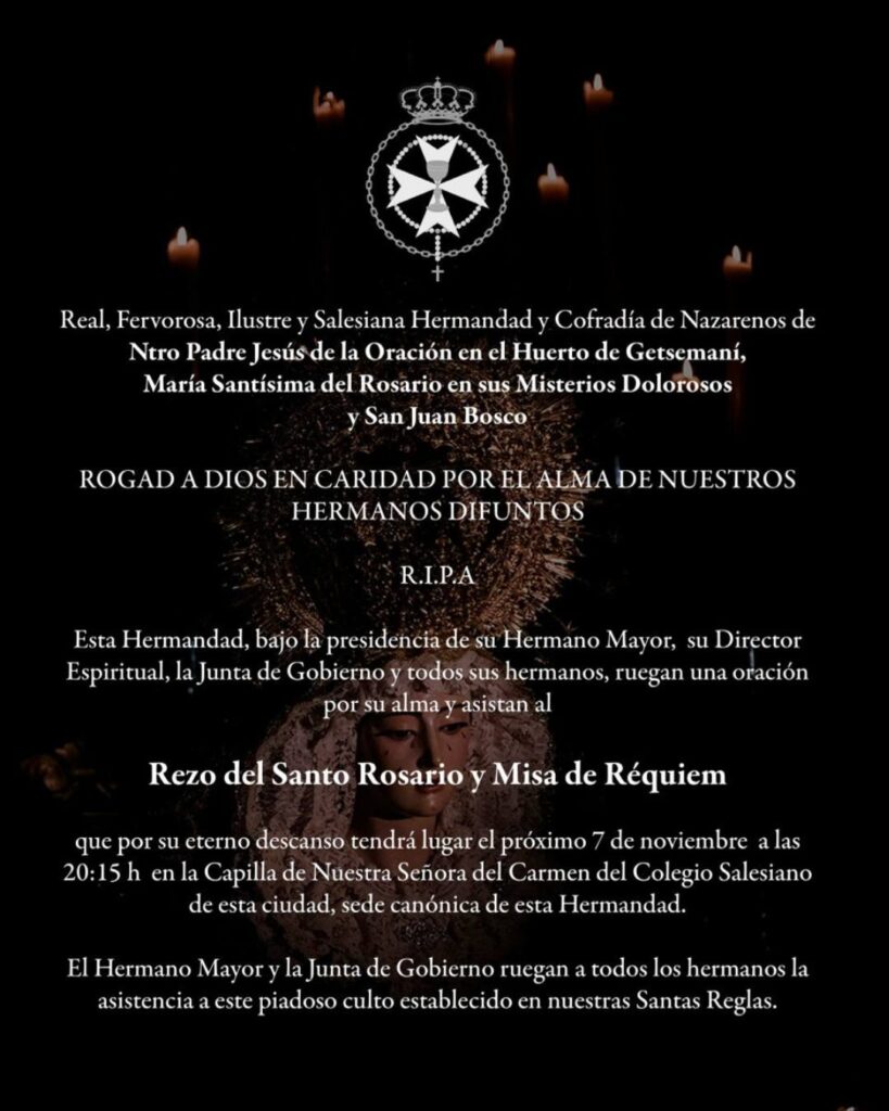 El próximo viernes 7 de noviembre a las 20:15h, la Hermandad celebrará Santa Misa de Réquiem en honor a todos los hermanos y familiares difuntos.