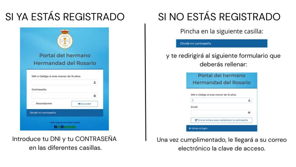 Si precisan su contraseña para realizar la reserva y obtención de papeleta de sitio o para cualquier otra consulta, pueden obtenerla dirigiéndose a la página web de la hermandad, accediendo al PORTAL DEL HERMANO, y una vez desplegada pinchar en “recordatorio contraseña”, indicando el email, donde recibirá los datos de su contraseña. Para ello, debe constar correctamente su DNI en su ficha, excepto los menores de 14 años que deben acceder con el código de hermano.