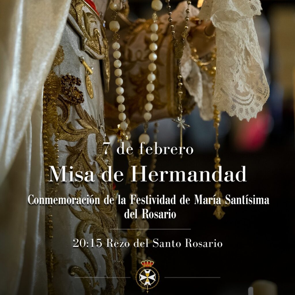 Con motivo de la Conmemoración de la Festividad de María Santísima del Rosario, el próximo sábado 7 de febrero celebraremos nuestra Misa de Hermandad.
