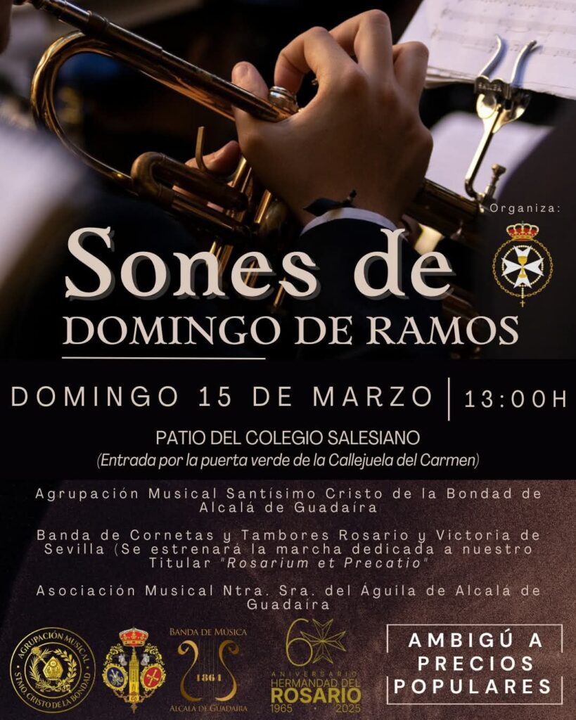 Alcalá de Guadaíra calienta motores para su Semana Mayor con un certamen que aúna estrenos musicales, compromiso social y la mejor tradición cofrade. Hoy 15 de marzo, el aroma a incienso y el sonido de la madera al andar parecerán estar un poco más cerca. La Hermandad del Rosario organiza una nueva edición de su ya emblemático certamen “Sones de Domingo de Ramos”, una cita ineludible para los amantes de la música procesional que arrancará a las 13:00 horas en el patio del Colegio Salesianos.