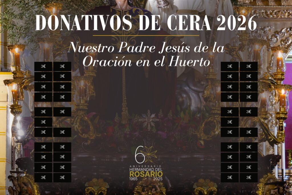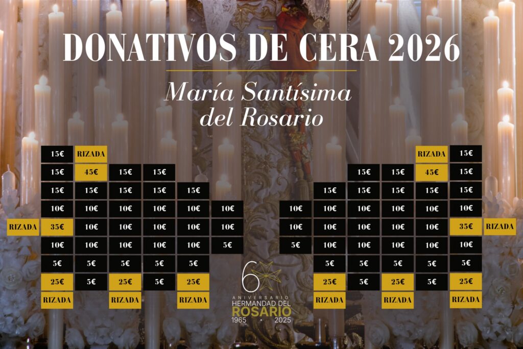 La Hermandad pone a disposición de los hermanos, hermanas y devotos un año más, la cera de los pasos de Nuestros Amantísimos Titulares que los alumbrarán el próximo Domingo de Ramos.