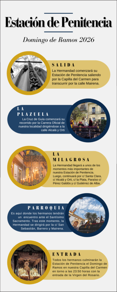 Los hermanos que realicen la Estación de Penitencia, deberán acceder por la puerta verde de la callejuela del Carmen a la Casa Salesiana entre las 17:00h y las 18:00h, acreditando junto a la Papeleta de Sitio su Documento Nacional de Identidad. Este mismo horario será el que esté disponible para todas las personas que deseen tener un momento de oración ante nuestros Titulares antes de la Estación de Penitencia. El rezo del Santo Rosario se realizará a las 17:30 h. La salida de la cofradía será a las 18:30h.